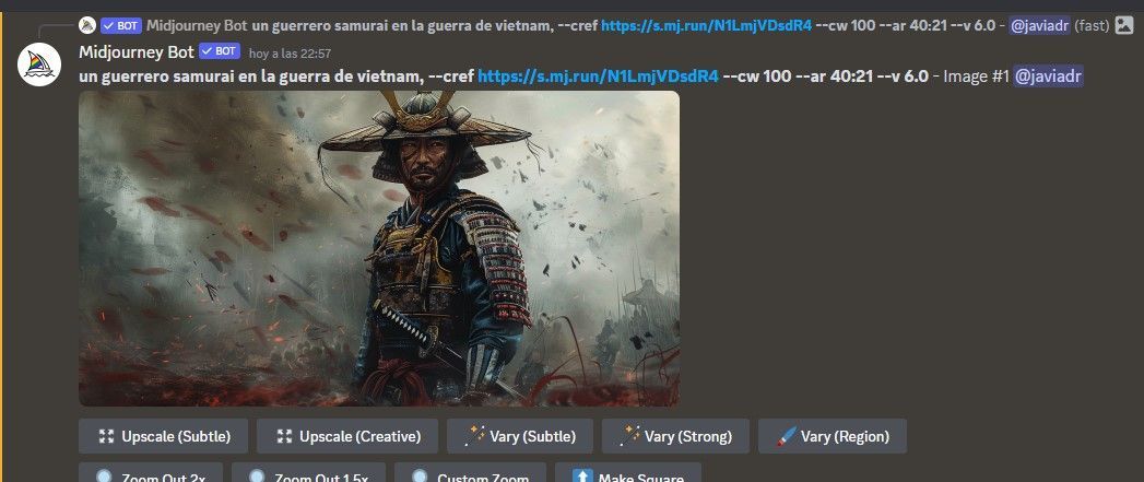 - Escribe un prompt como de costumbre, pero añade "--cref (URL de la imagen base) --cw 100" al final. El valor de "cw" (peso del personaje) determina la fidelidad a la imagen original. Un valor de 100 la mantiene intacta, mientras que valores más bajos introducen variaciones.